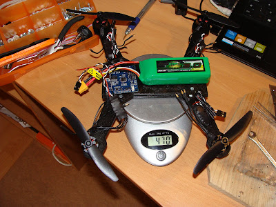 Am și cântărit toate componentele și am ajuns la 470 grame. Estimez ca s-ar mai adăuga încă 400 de grame cu alte component. Sper sa și zboare ….. 😀