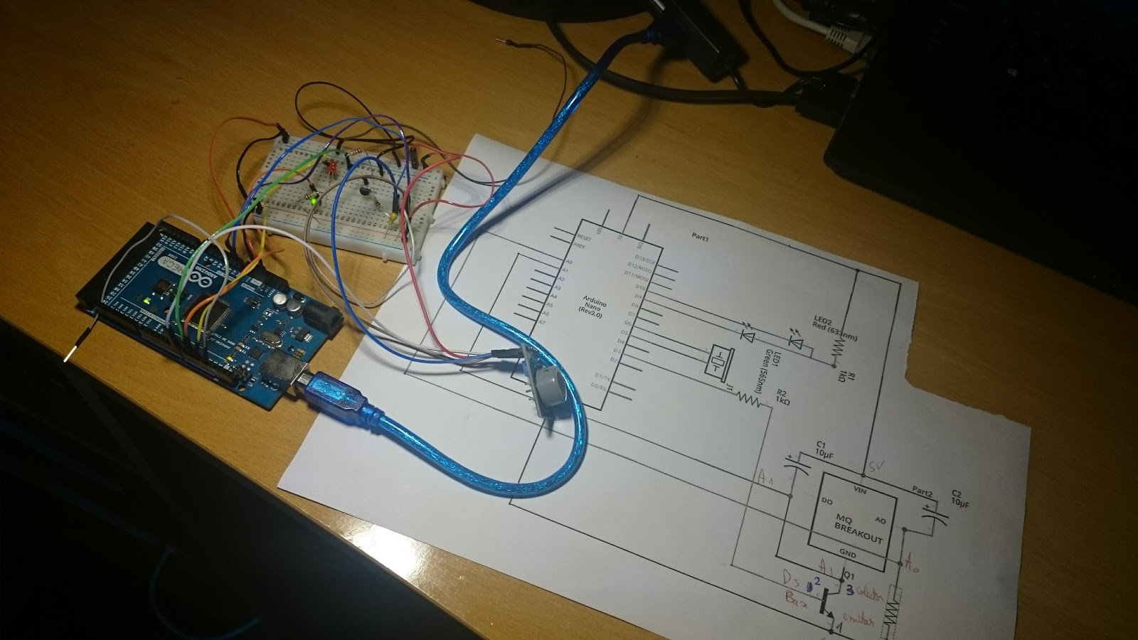 Acest proiect urmărește măsurarea consumului de monoxid de carbon folosind senzorul MQ-7. Măsurarea se face in cicluri de câte 90 de secunde la voltaj de 1.4 . Mai multe informații găsiți pe Instructables. Modulul MQ-7 nu se poate folosi așa cum e, ci are nevoie de un circuit de temporizare care-l activează și citește concentrația de CO câte 90 de secunde iar apoi îl dezactivează 60 de secunde. Am construit si eu circuitul și din punctul meu de vedere am obținut un rezultat bun.
