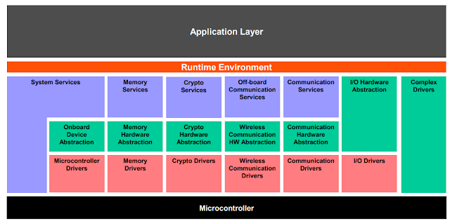 Arhitectura în straturi a AUTOSAR poate fi împărțită în software-ul de bază (BSW), Runtime Environment (RTE) și stratul de aplicație / componentă software Application layer.