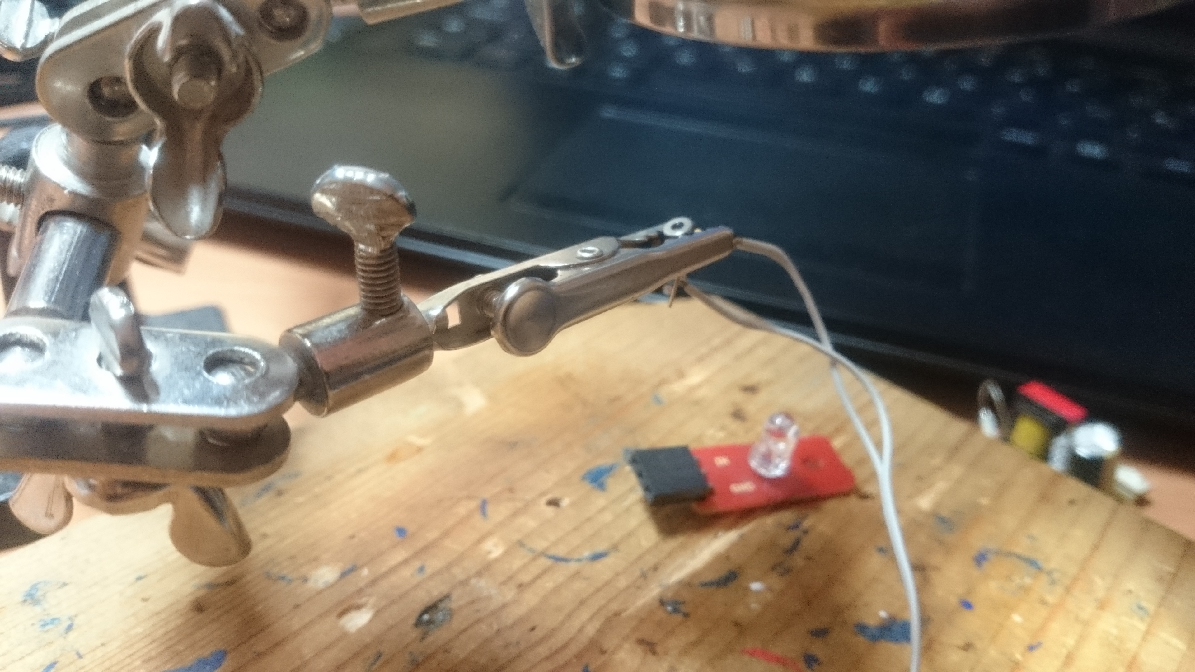 Din păcate ceva am greșit la circuitul de mai sus , pentru că am alimentat circuitul la 9 volți și am crescut ușor rezistența folosind potențiometrul. Din câte am observat dioda s-a activat, și a emis un fascicul laser, dar după câteva minute s-a ars. Cred că am mărit prea mult curentul și care mai departe a prăjit dioda.