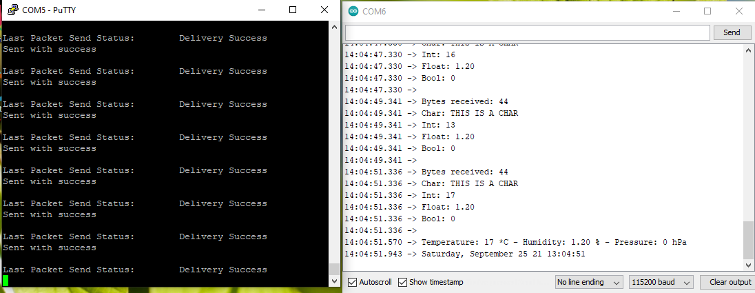 În screenshotul de mai sus am afișat si pe serial schimbul de informații dintre cele două plăci.